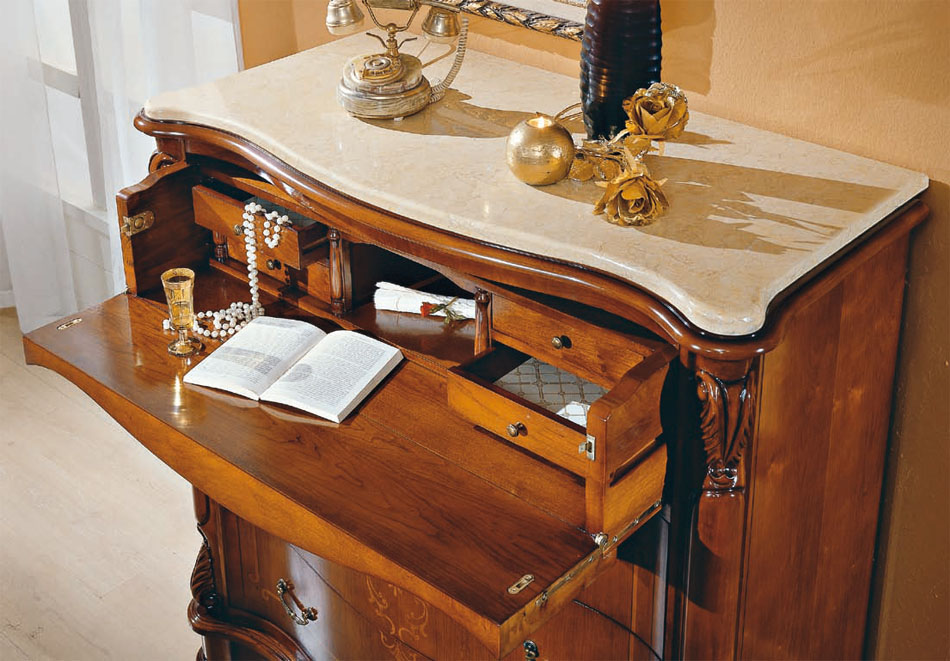 Gruppo in legno impiallacciato ciliegio tinto noce.Comò con ribalta estraibile e comodino con cassetto segreto sullo zoccolo.Cassetti con coda di rondine e fondini tappezzati.Disponibili con o senza marmo.